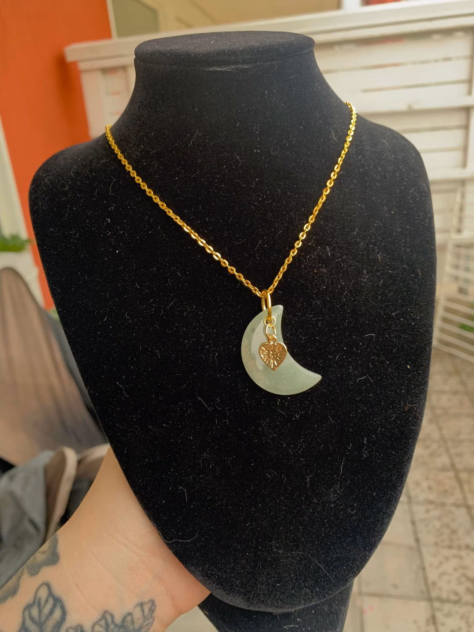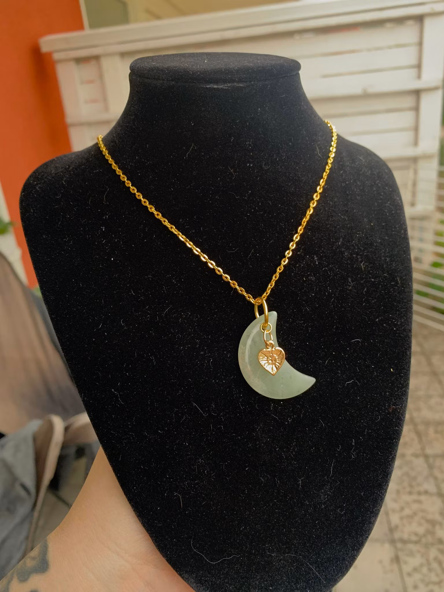 Halsband i guld med måne i grön aventurin och hjärta berlock
