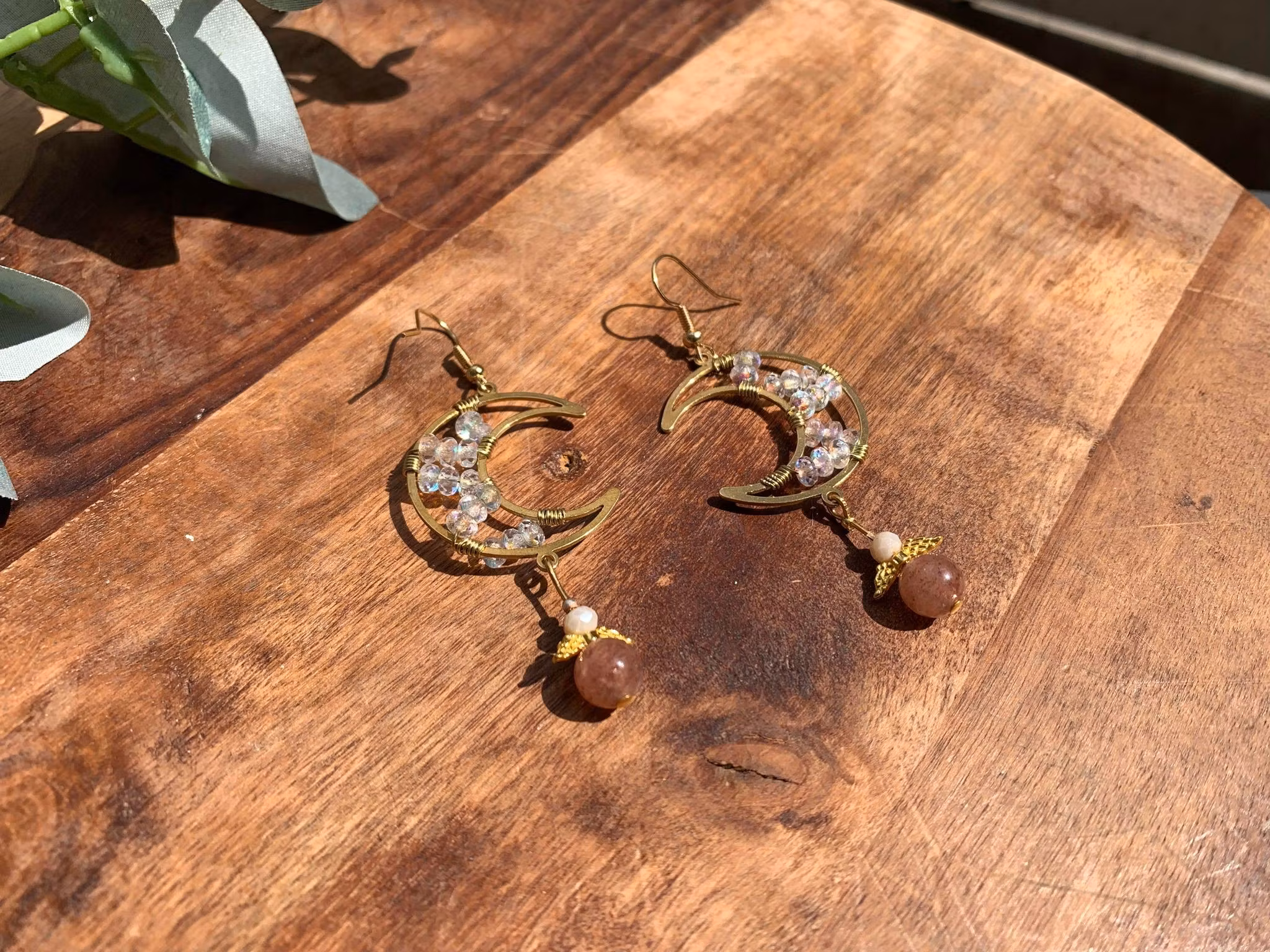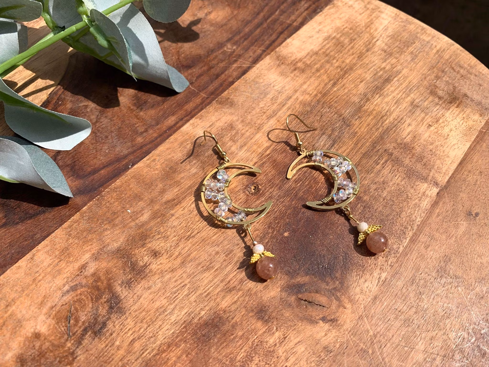 Guldpläterade örhängen med mässing månar, glas pärlor, metall vingar och jordgubbskvarts pärlor