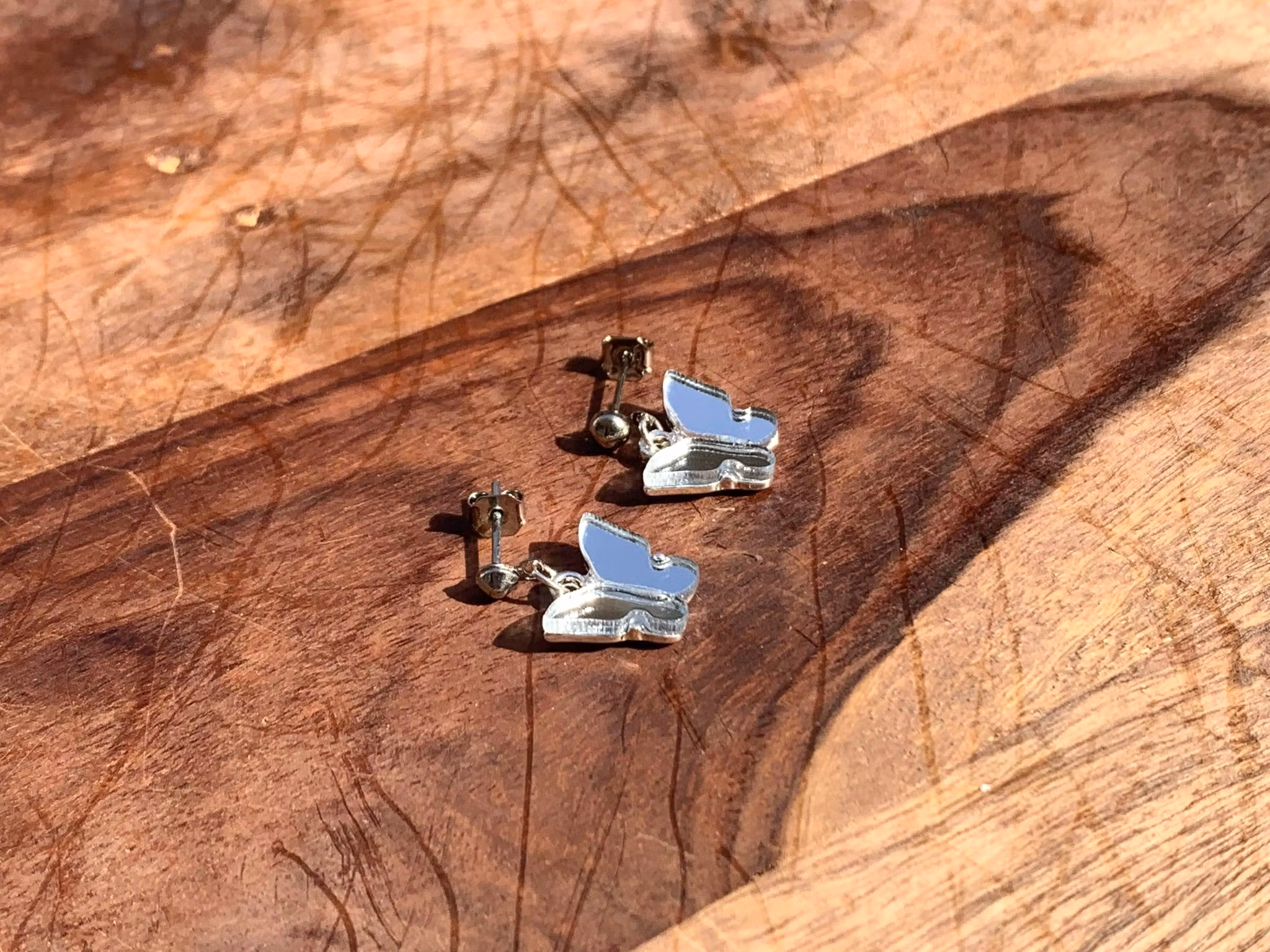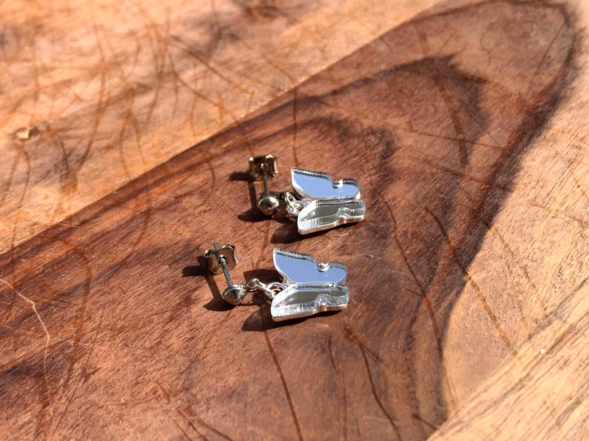 Söta små örhängen med silver stickor och "spegel effekt" fjäril berlock