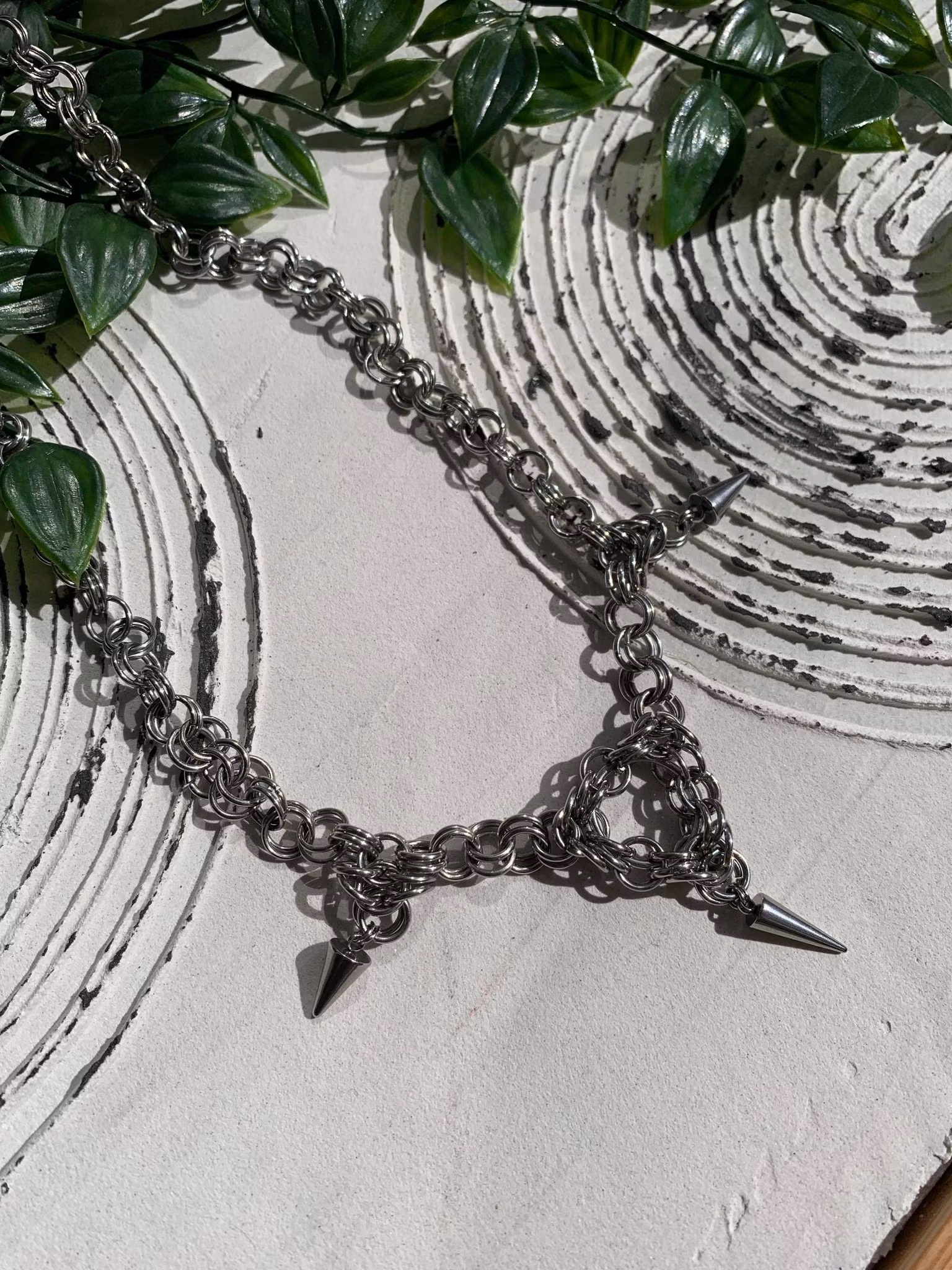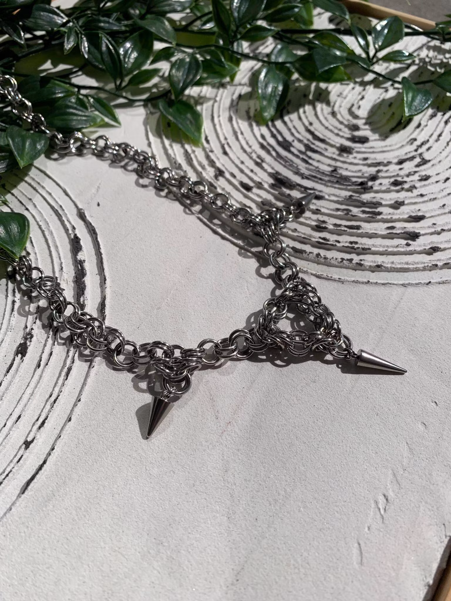 Add a rebellious touch to your overall look with this stainless steel chainmaille necklace, stainless spikes and metal rings