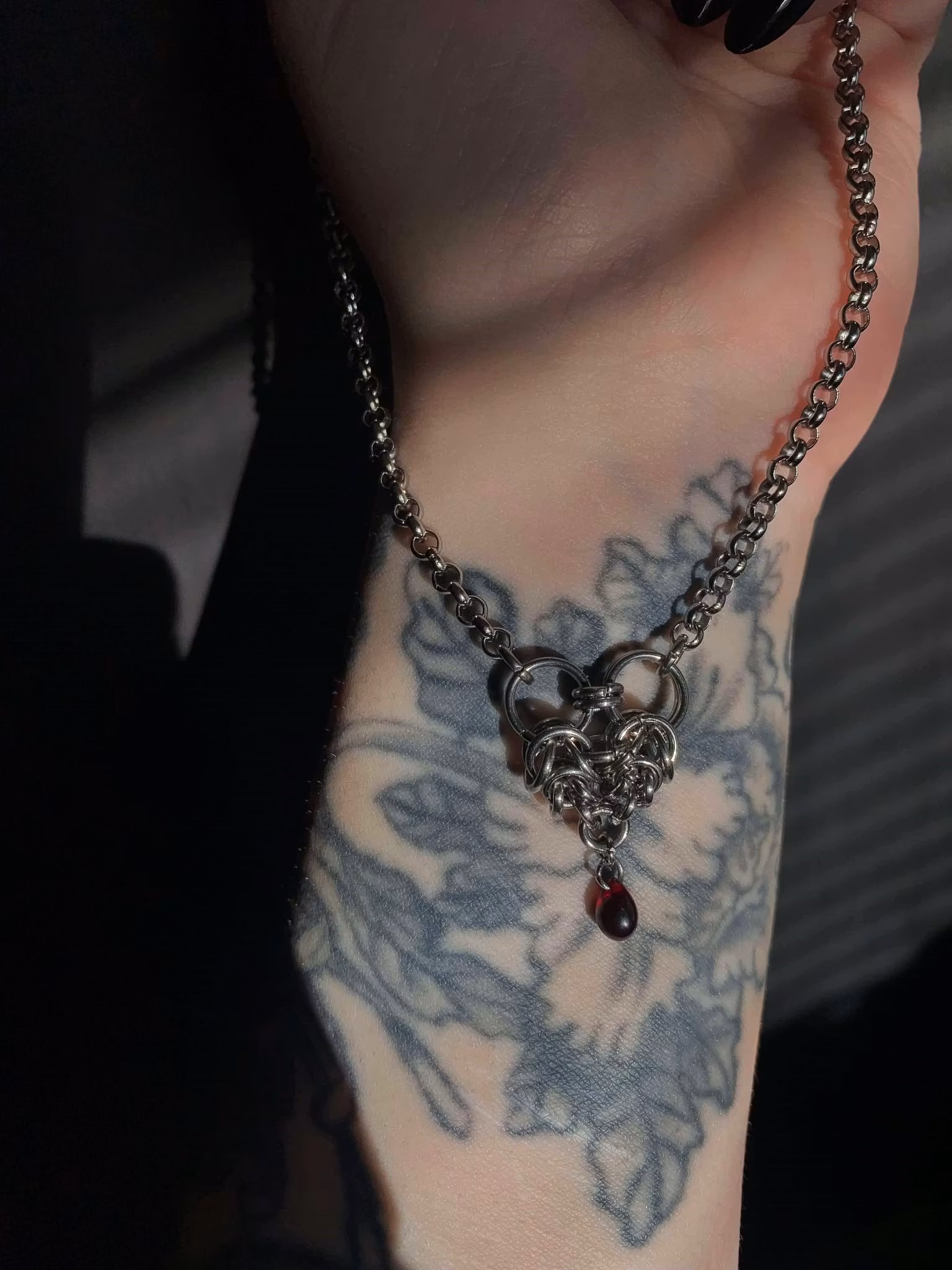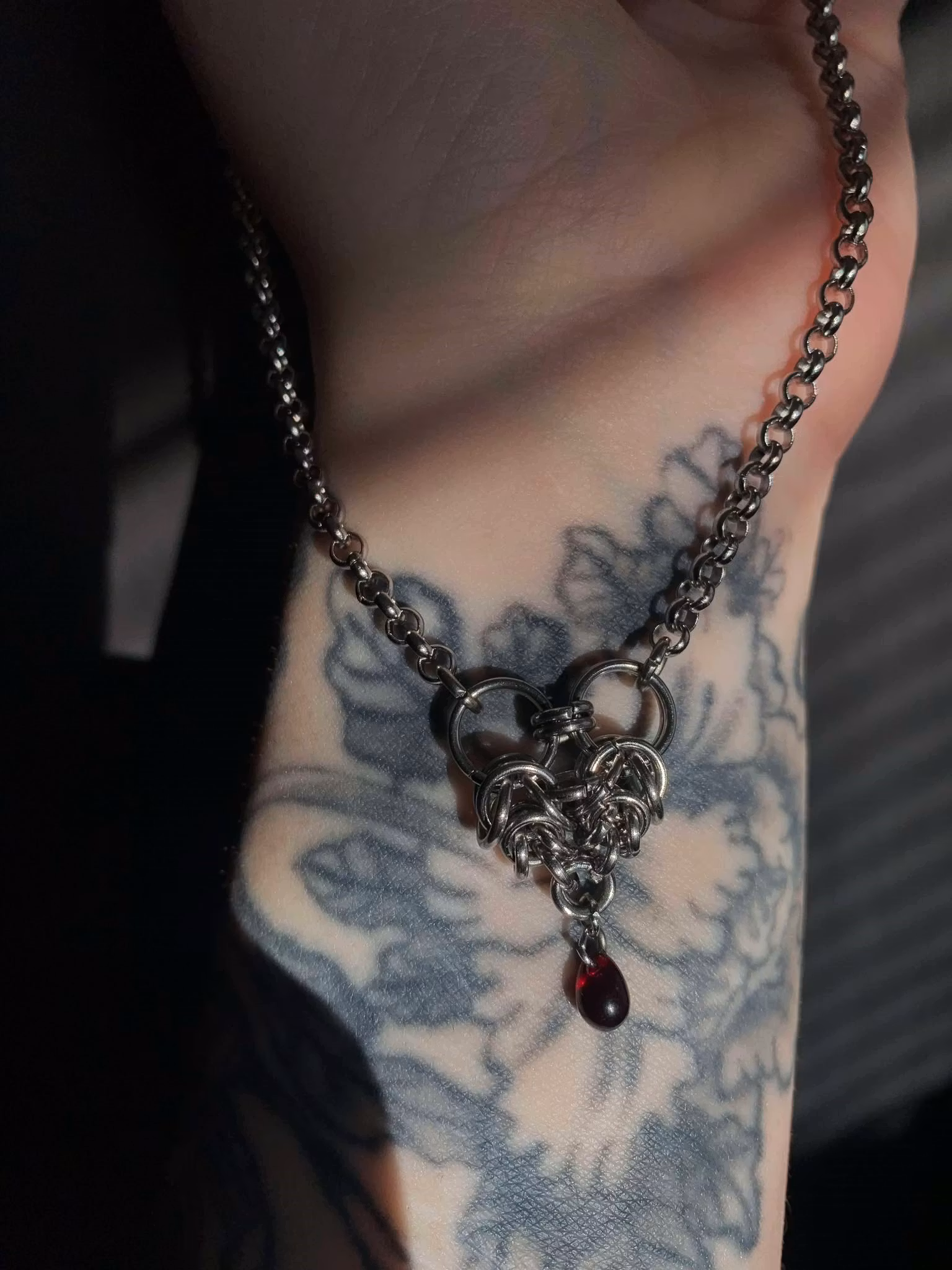 Stainless steel chainmaille heart and chain with a czech drop bead