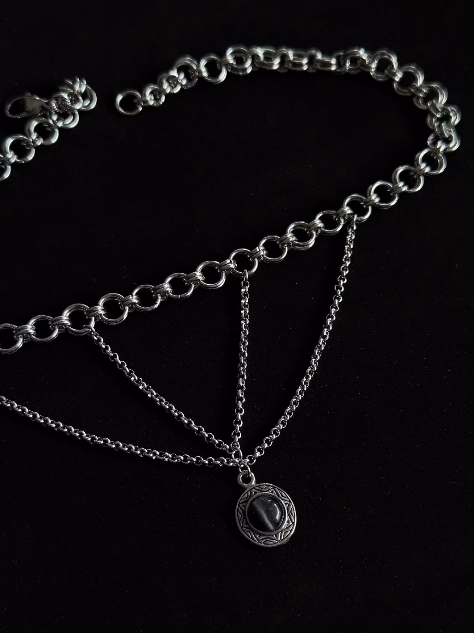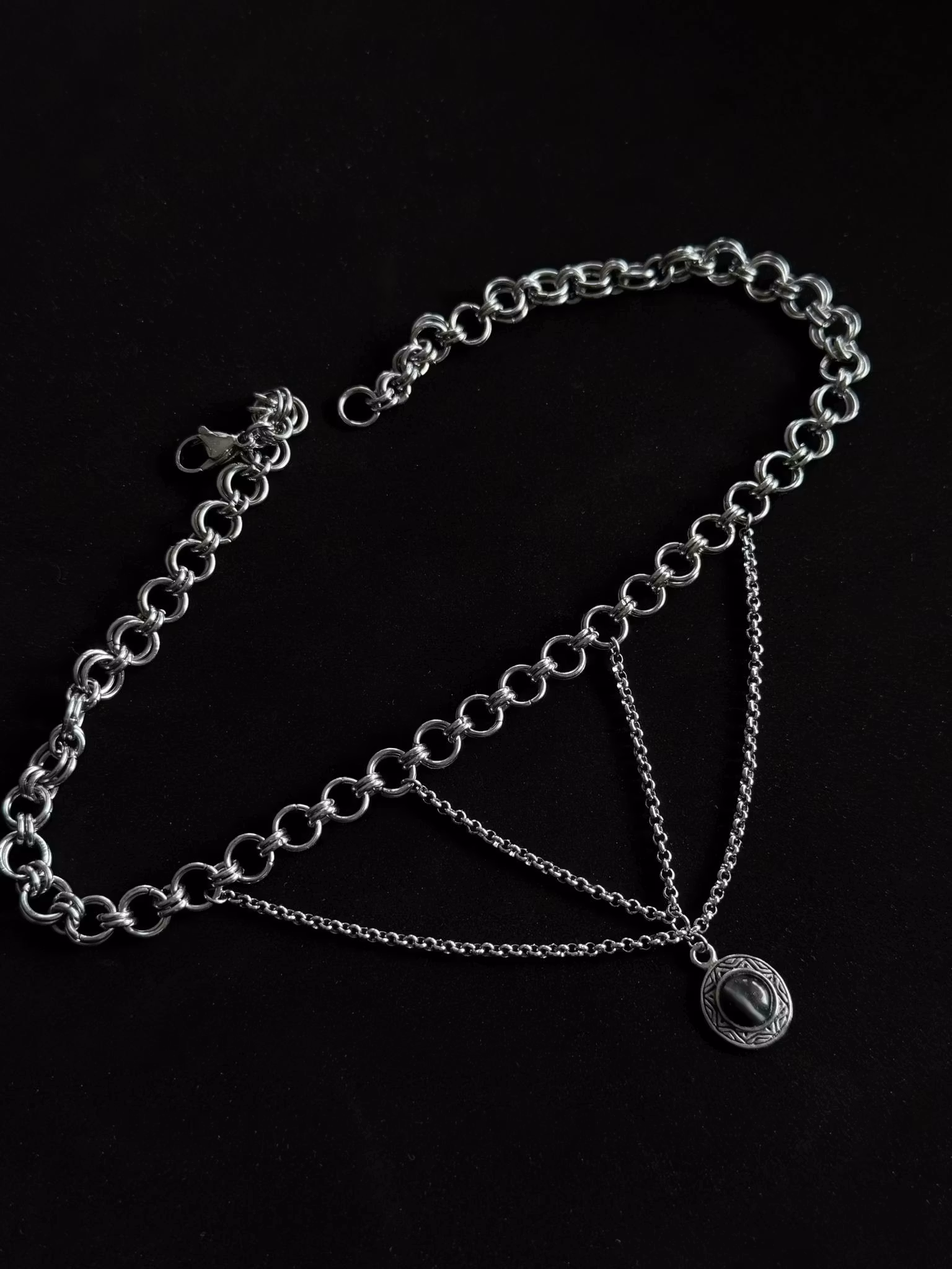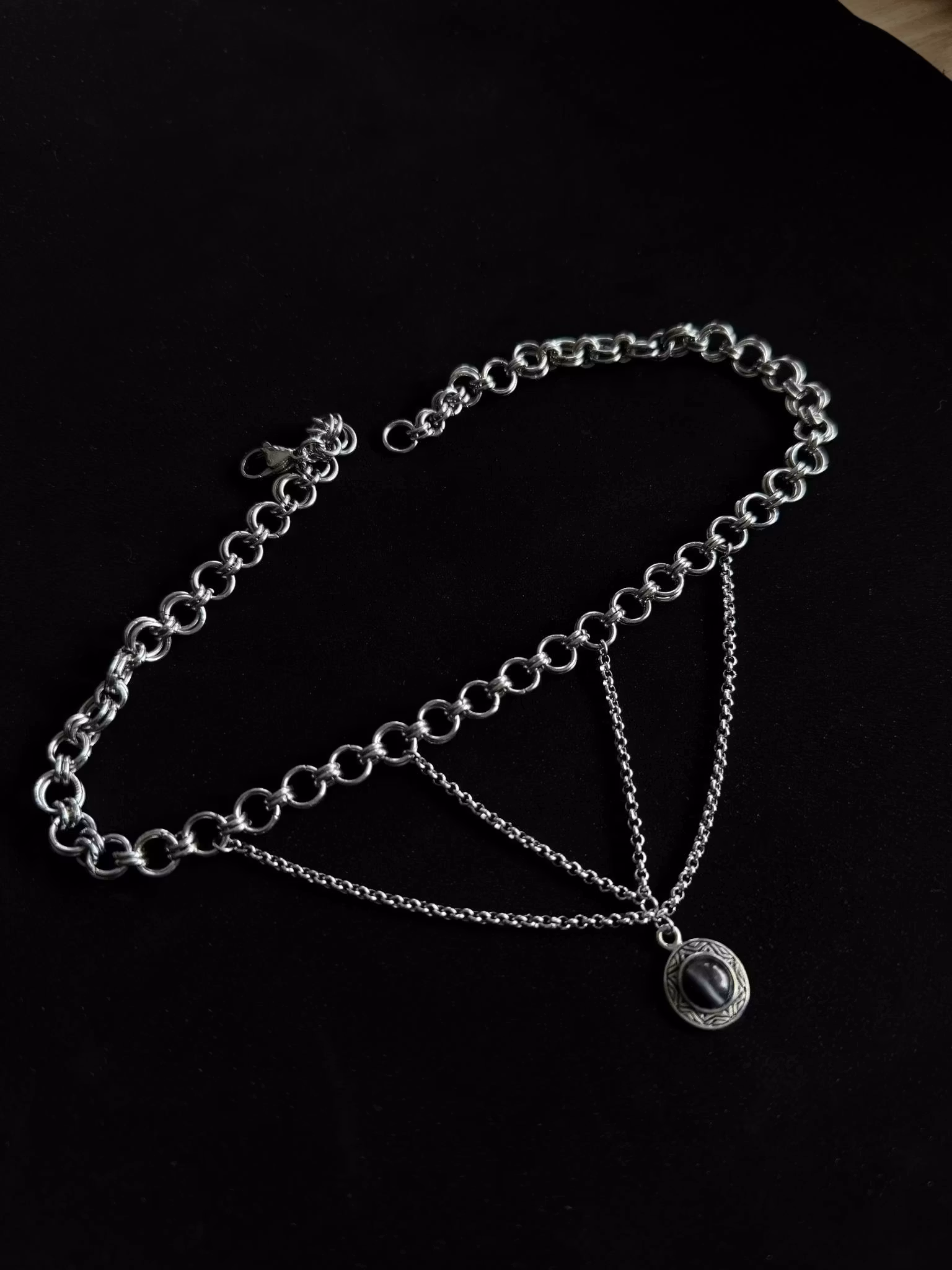 Stainless steel chains and chainmaille with a thrifted catseye pendant