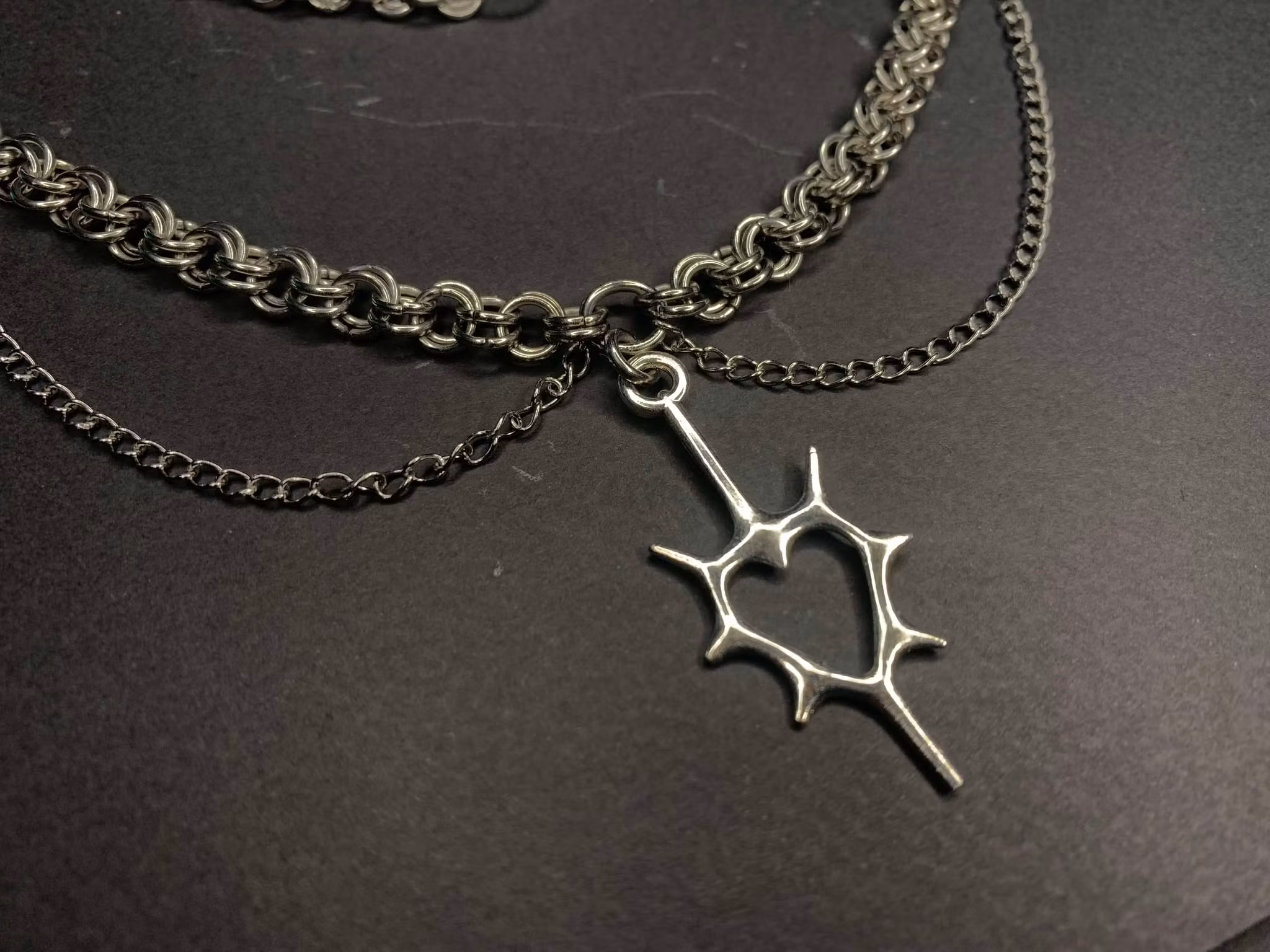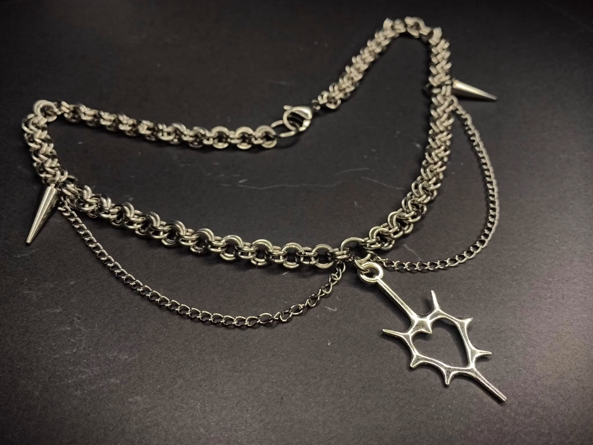Two spike pendants adorn this chainmaille necklace on either side, a spiky heart used as the center piece