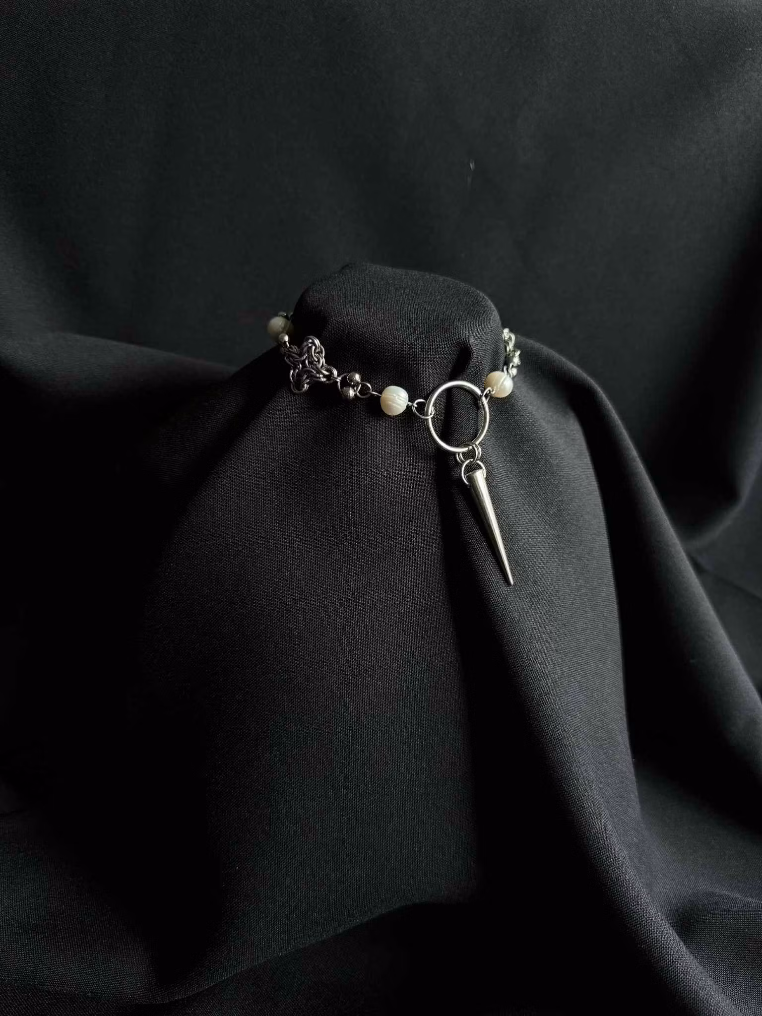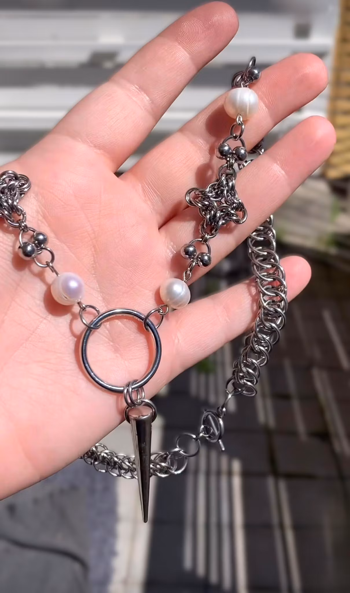 Stainless steel chainmaille and beads, genuine freshwater pears, metal ring and metal spike