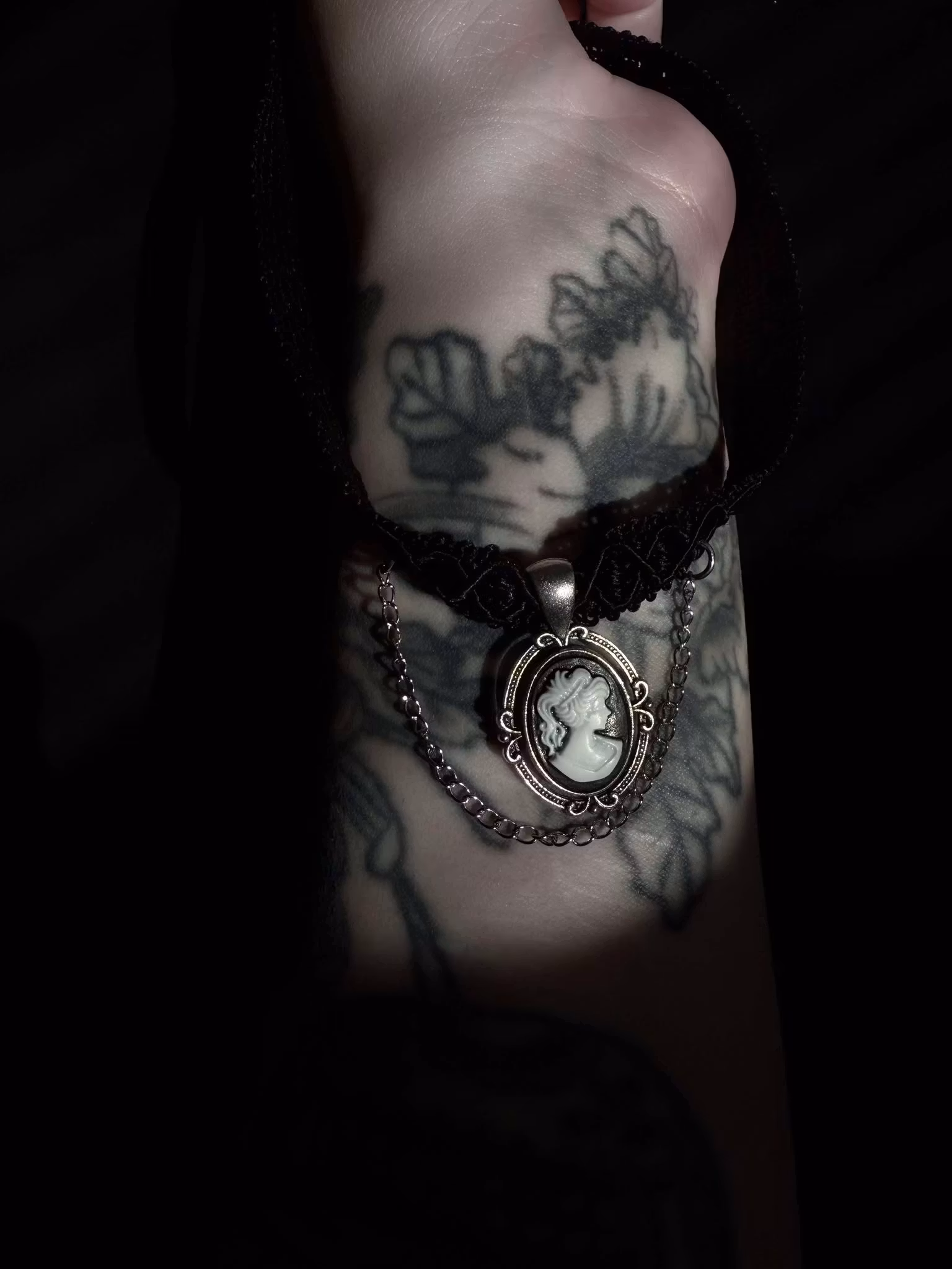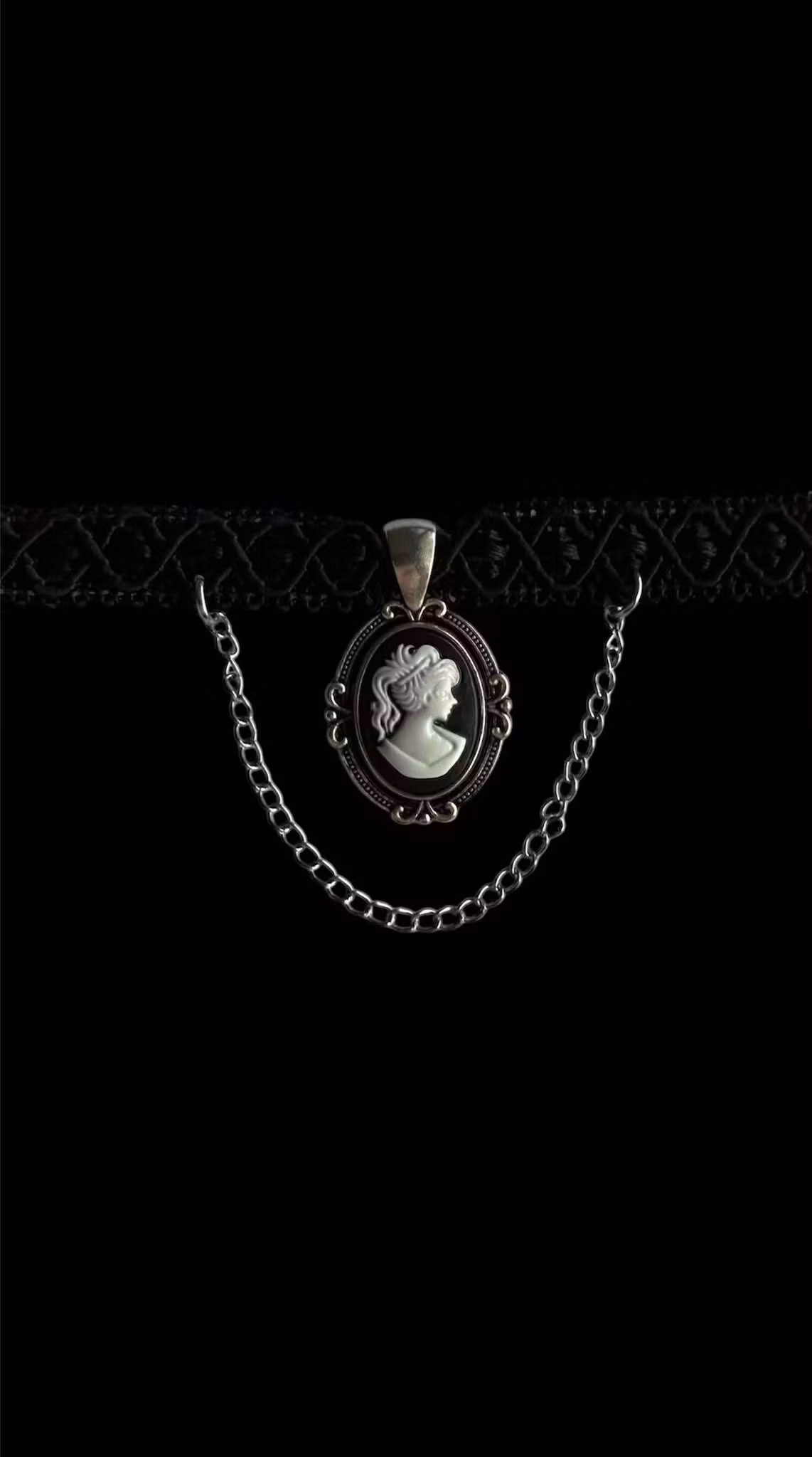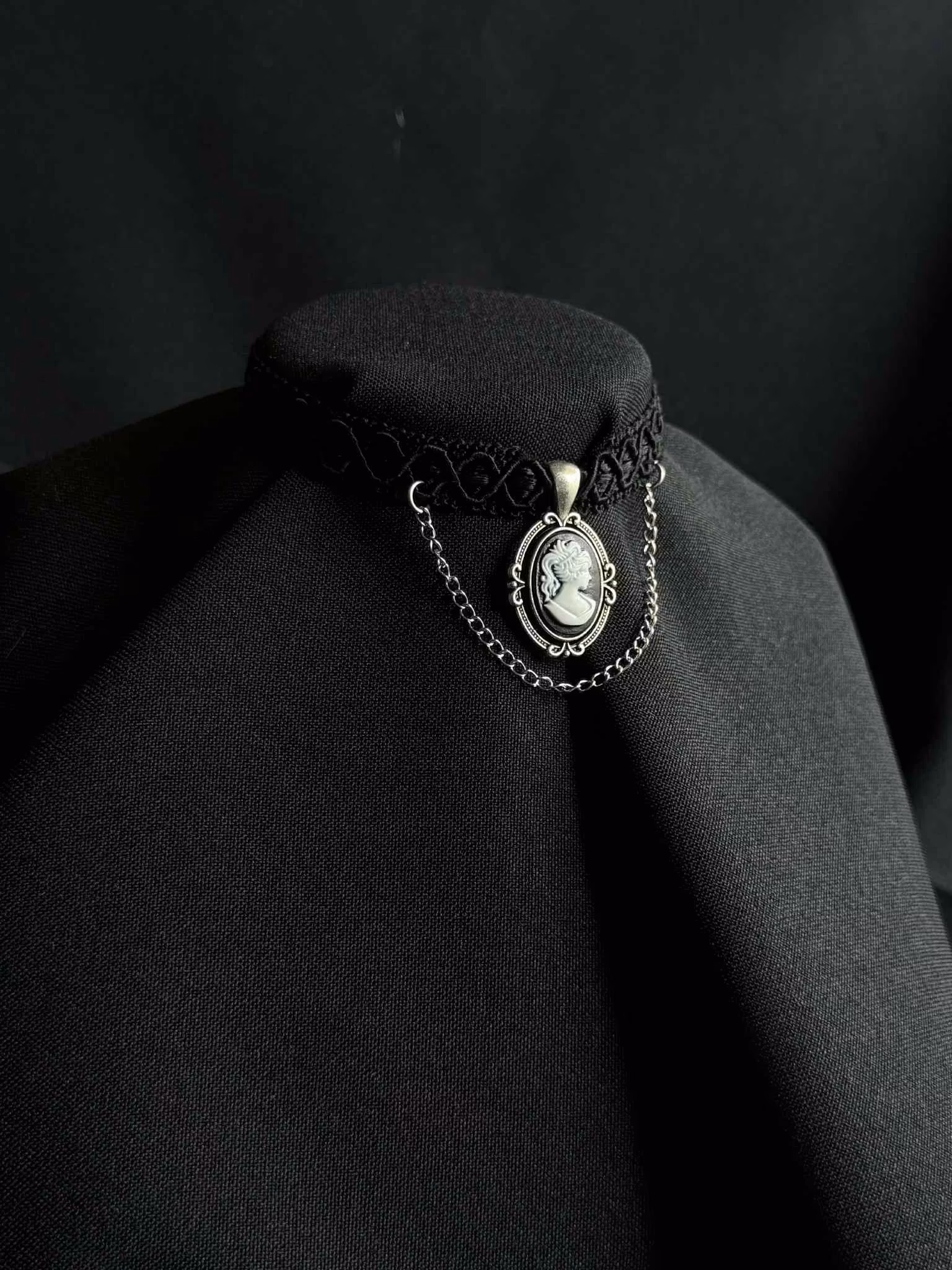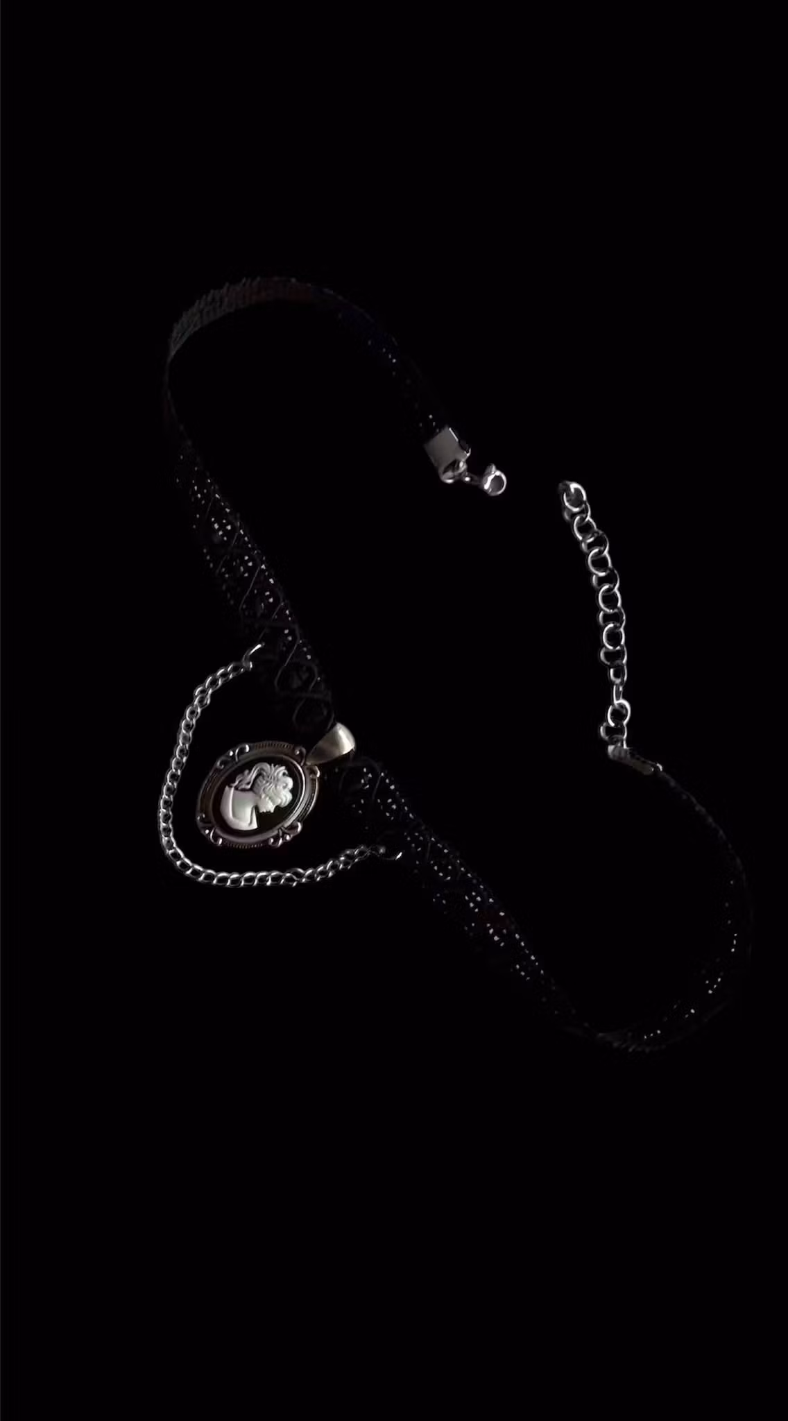 Fabric choker with stainless steel details and chain and a thrifted cameo charm